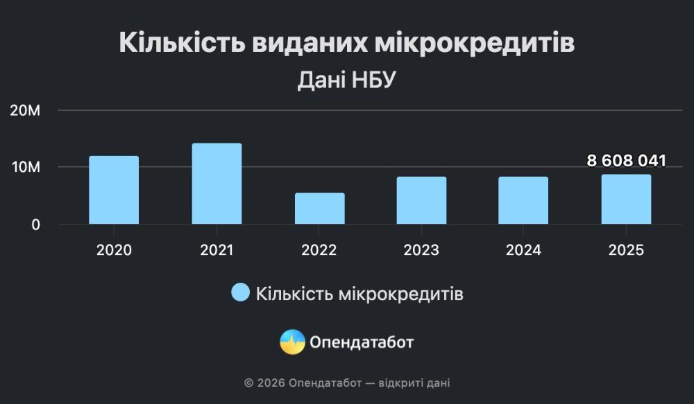 8 608 041 мікрокредит взяли українці торік. Загалом у МФО напозичали на 56,76 млрд грн. Попри те, що кількість позик майже не змінилась (+3% за рік), обсяг ринку зріс на 10%.