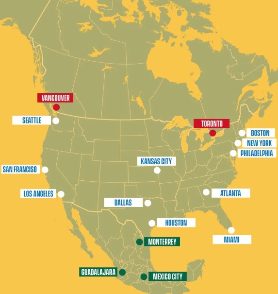 Матчі відбудуться в таких містах: США (11 міст), Мексика (3 міста) та Канада (2 міста).